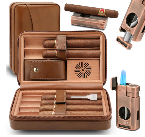 Cigar Humidor, Leather Cedar Wood Cigar Case with Cigar Lighter, V Cut Cigar Cutter, Cigar Holder 3 in 1, Portable Travel Cigar Humidor Box with Humidifier (Brown)